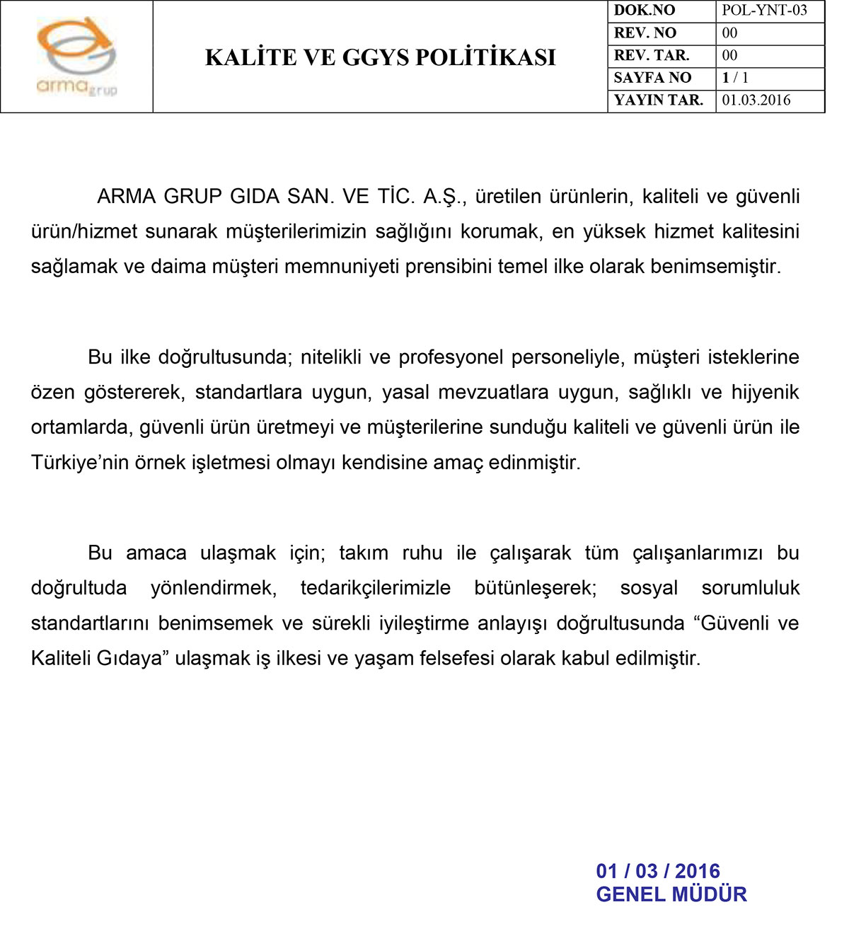 Arma Grup şirketlerinin kuruluş amacı; 5 yıllık bir iş planı çerçevesinde sektörde satış hacmi, uzman ve deneyimli kadrosu, üretim kalitesi ve kurumsal yapısı ile sektör lideri olmak, ulusal ve uluslararası piyasalarda piyasaya yön vermektir. Grubumuz hedeflerine ulaşmak için yatırımlar yapmaya devam etmektedir. Toplam 6.000 m2 kapalı üretim alanı, 50.000 adetlik günlük üretim kapasitesi ve 95 kişilik kalifiye personel kadrosuyla bölgesel, ulusal ve uluslararası alanlarda satış yapmaktadır. Şirketimizin en büyük yatırımı personel kadrosudur. Alanında uzman ve şirket bağımlılığı üst düzeyde çalışan kadrosuna sahiptir.